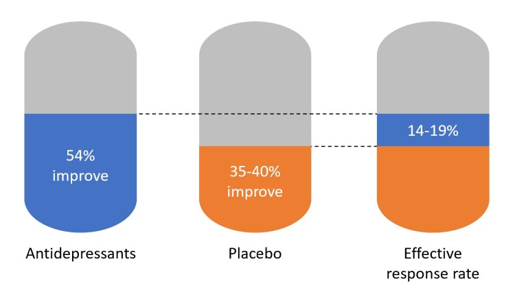 - 54% of adults on antidepressants showed improvements (at least a reduction in 50% of their symptom). However, 35-40% of adults on a placebo pill (e.g. inert pill without any active ingredients) also showed similar improvements. This meant that antidepressants have an ‘effective response rate’ (response rate over and beyond placebo) of somewhere between 14-19% in adults. Simply put, antidepressants are about 14-19% more beneficial than eating an inert/sugar pill in the treatment of depression based on the study.