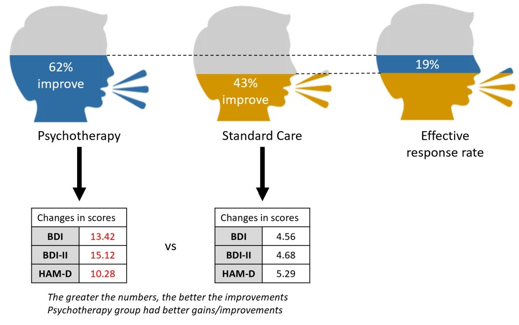 - 62% of adults receiving psychotherapy for depression (66% if they received CBT specifically) showed significant improvements (they were in remission and no longer met the diagnostic criteria for Major Depressive Disorder). However, 43% of adults who were receiving standard care for depression and not psychotherapy also showed similar improvements. This meant that psychotherapy had an effective response rate of roughly 19% as well (23% for CBT). Simply put, going for psychotherapy is about 19% more beneficial than receiving standard care in the treatment of Major Depression.