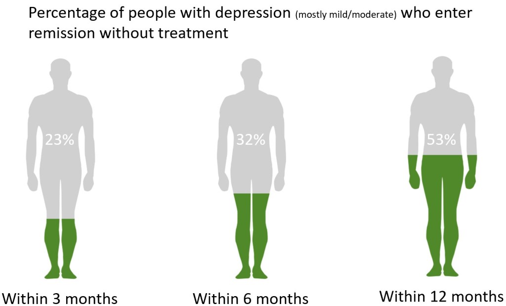 - A closer look at the original article by Whiteford and colleagues (2013) showed that 23% of untreated depression enter remission in 3 months, 32% enter remission in 6 months, and 53% in 12 months. However, in their study, the majority of depressive cases were in the mild-to-moderate range. Therefore, the same numbers may not apply to those who are severely depressed.
