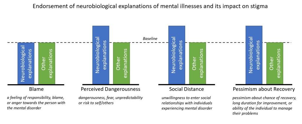 That is to say, while individuals who thought mental illnesses had neurobiological underpinnings did not blame sufferers more, they thought that they were more dangerous, were less likely to recover, and were more unwilling to enter social relationships with them.