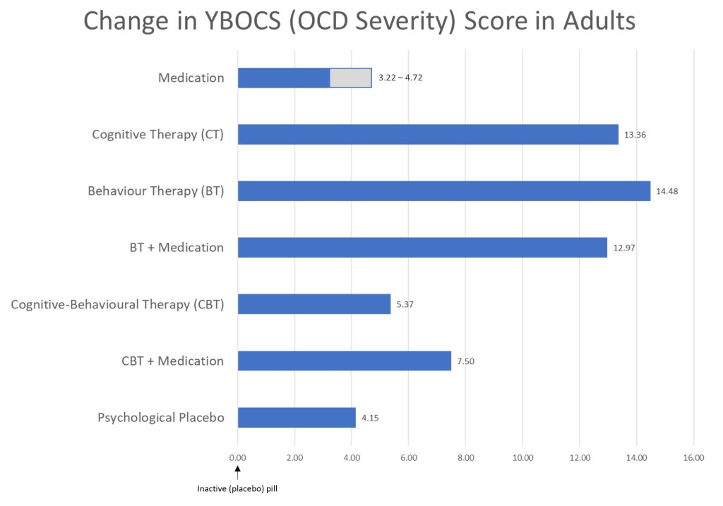 In treating OCD in children and adolescents, CBT in combination with medication (or a placebo pill) were the most efficacious, followed by CBT alone and behavioural therapy. Behaviour therapy in combination with medication did not perform quite as well, and was comparable to medication alone or psychological placebo.