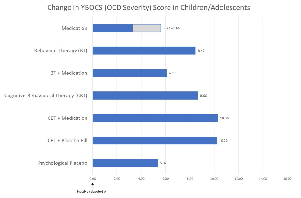 Similar to the treatment of OCD in adults, all evaluated interventions in children and adolescents were superior to placebo (baseline score of ‘0’).