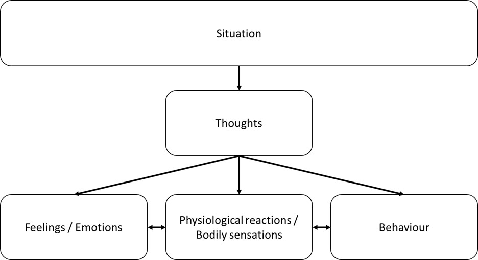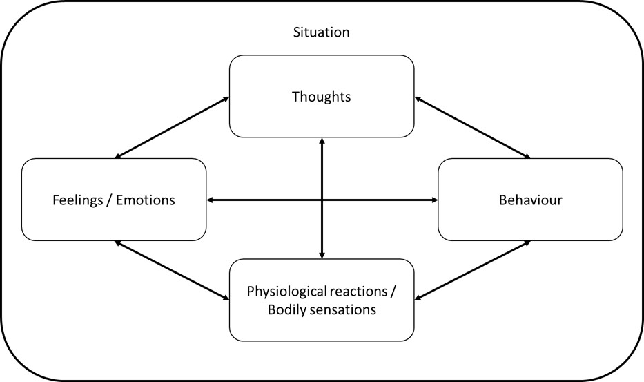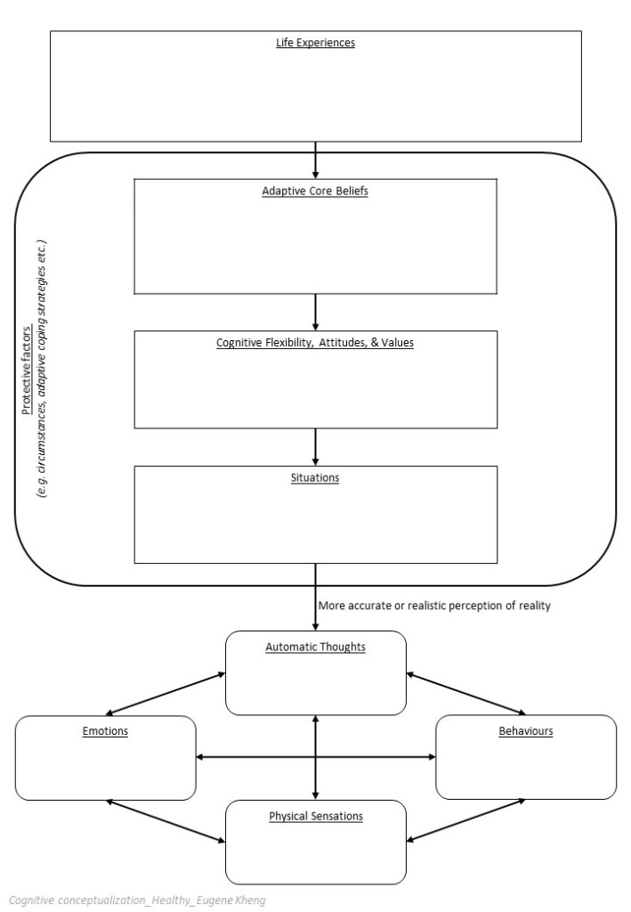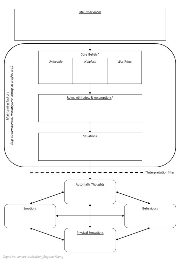 As you can see, CBT is more than just ‘thoughts influence feelings and behaviours’. Based on my personal understanding, a general CBT conceptualization might look something like this: