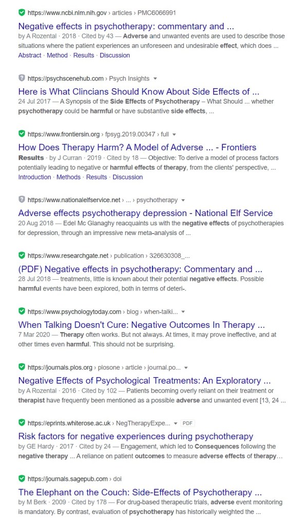 To some, the reason to consider psychotherapy above other treatment options is in its apparent lack of side effects (Linden & Schermuly-Haupt, 2014). Well, psychotherapy is after all just a process of talking about one’s problems right? What harm could possibly come out of it? Included below are screengrabs of statements made by fellow clinicians.