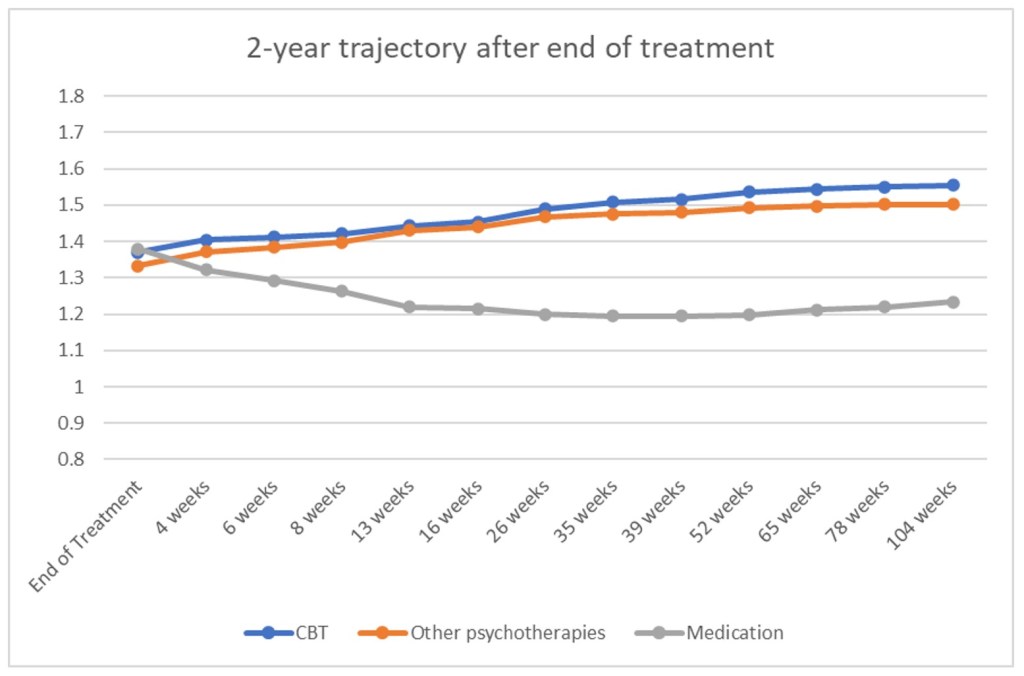 In short, those who had psychotherapy continued to make improvements for 2 years after treatment had ended. Those who took medication experienced a slight (but non-significant) worsening of their anxiety symptoms over 2 years after they had stopped medication.