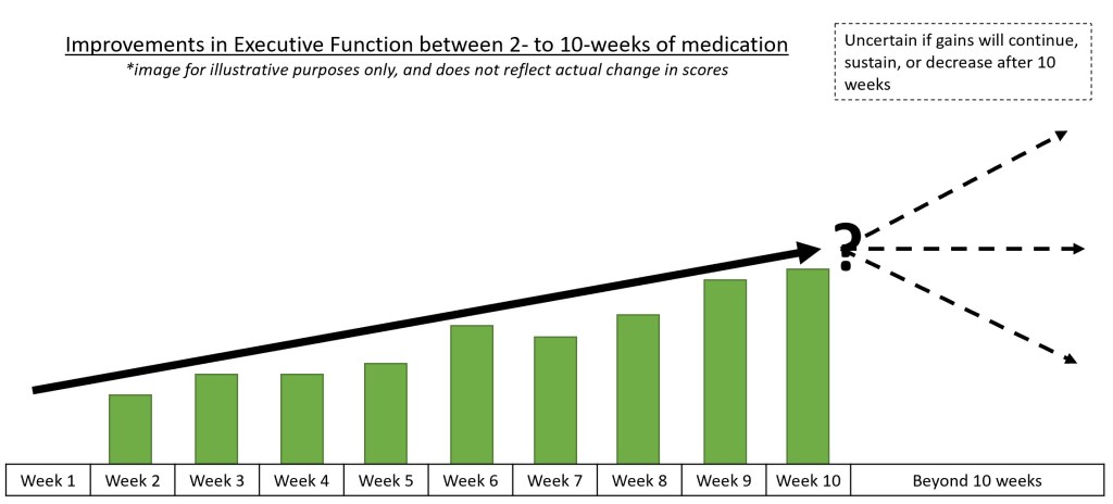 - Studies which examined the impact of pharmacotherapy on executive functioning (measured using the BRIEF-A instrument) reported moderate improvements across treatment. However, these studies did not evaluate if the gains were sustained beyond treatment phase. That is to say, patients who were started on medication showed improvements in their executive functioning between 2- to 10-weeks of medication. We do not have data to know if this improvement continued beyond 10 weeks, sustained beyond 10 weeks, or decreased after 10 weeks. As such, the study suggested that pharmacotherapy had resulted in short-term gains in executive functioning in adults with ADHD.