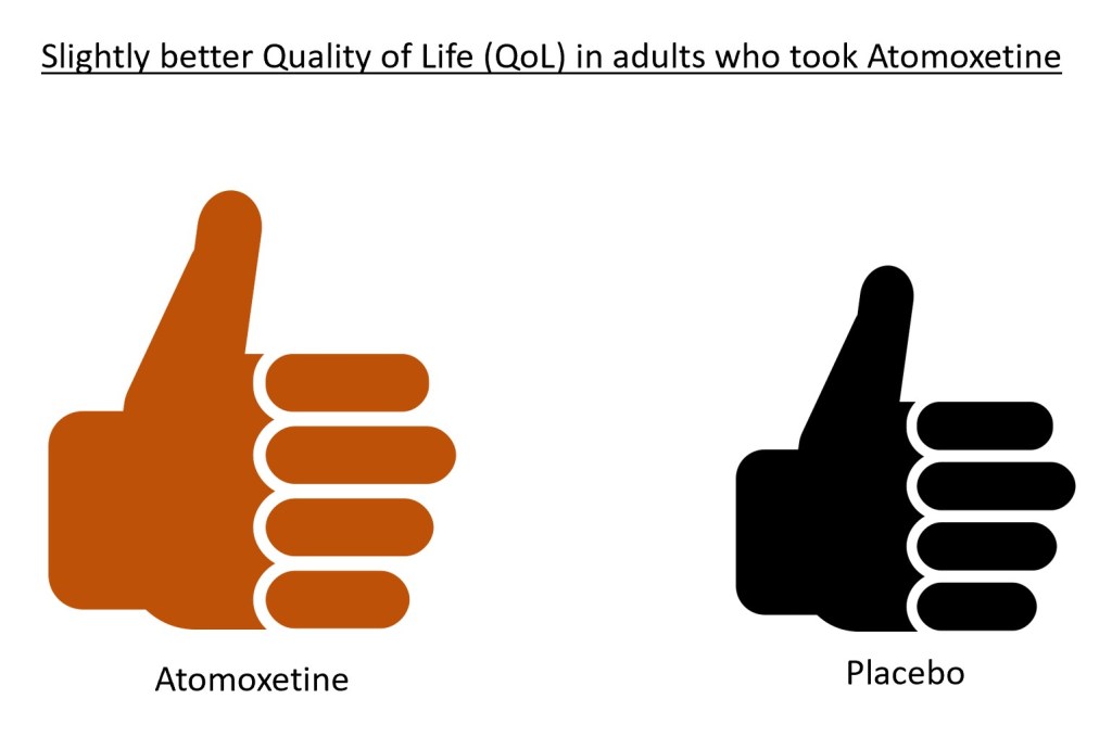 - Only 5 studies evaluated the impact of atomoxetine on Quality of Life (QoL). It was found that atomoxetine was associated with a slight improvement in the QoL of adults with ADHD. That is to say, adults with ADHD who took atomoxetine reported slightly better QoL compared to adults who took an inert pill. However, as this finding was from a small number of studies (only 5), caution is required when interpreting it due to risk of bias.