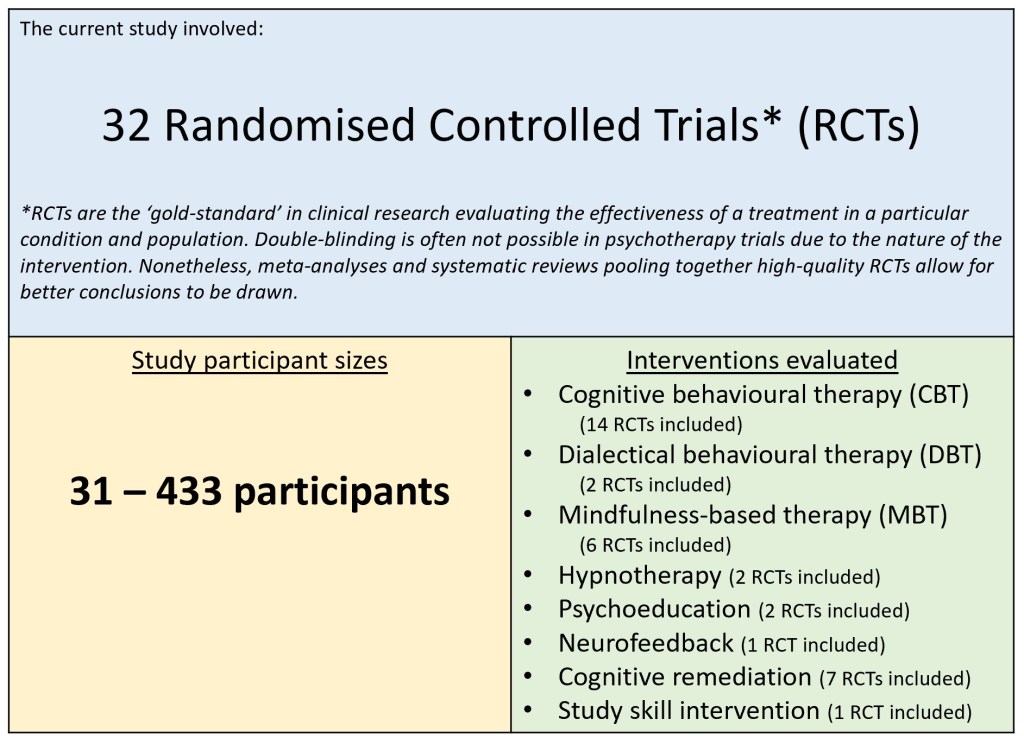 In this study, researchers conducted a systematic review evaluating 32 RCTs that cover 8 different psychosocial treatment for adults with ADHD: cognitive-behavioural therapy (CBT), dialectical behavioural therapy (DBT), mindfulness-based therapy (MBT), hypnotherapy, psychoeducation, neurofeedback, cognitive remediation (e.g. ‘brain training’), and study skill intervention.