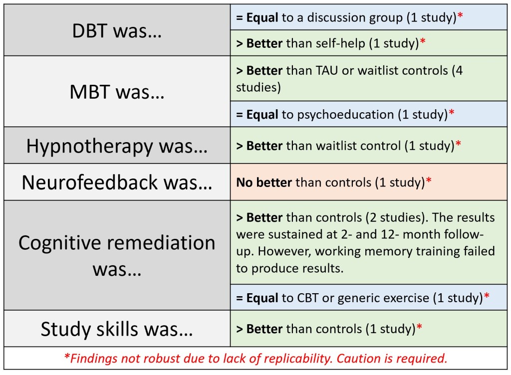 In the current systematic review unfortunately, due to a lack of replicability as well as a high risk of bias, robust conclusions cannot be made about the other psychosocial interventions. Nonetheless, it was noted that DBT, MBT, and cognitive remediation were promising treatments. Similar conclusions were made by López-Pinar et al. (2018). In their meta-analysis, while CBT was demonstrably superior to DBT and biofeedback (smaller effect sizes), DBT, MBT, and biofeedback were nonetheless promising treatments with potential to be alternatives to CBT.