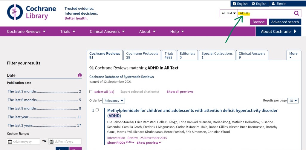 Step 3: Look for the review that meets your search criteria e.g. reviews examining the effectiveness of methylphenidate (Ritalin) on ADHD.